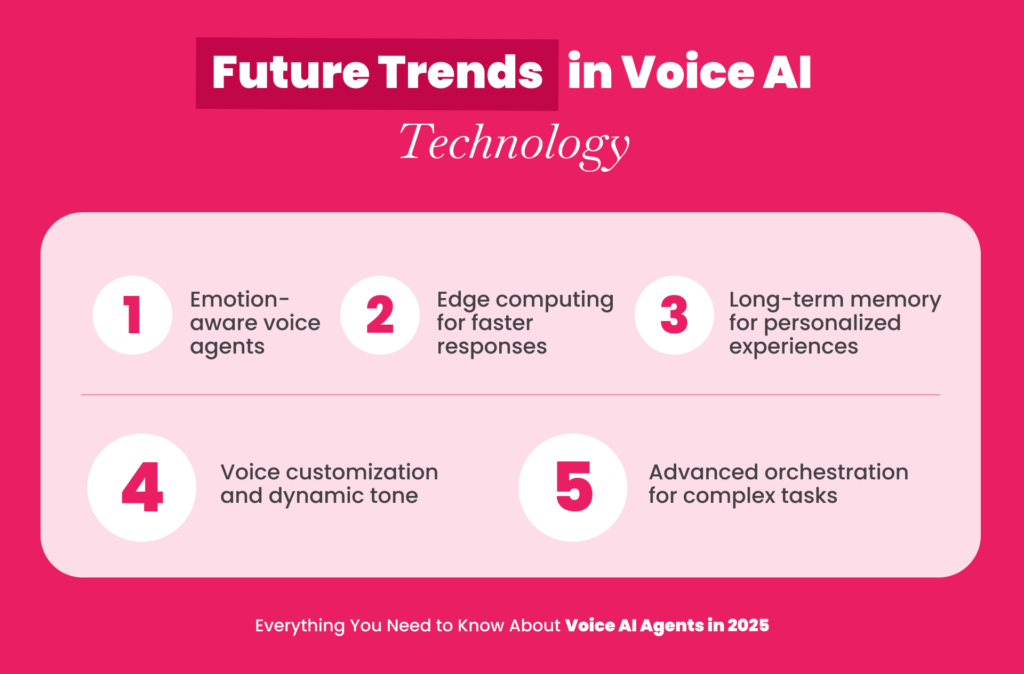 By 2025, voice AI is expected to become more emotion-aware, with faster response times due to edge computing. Weโll also see AI assistants with improved long-term memory, customizable voices, and the ability to handle complex tasks through advanced orchestration.