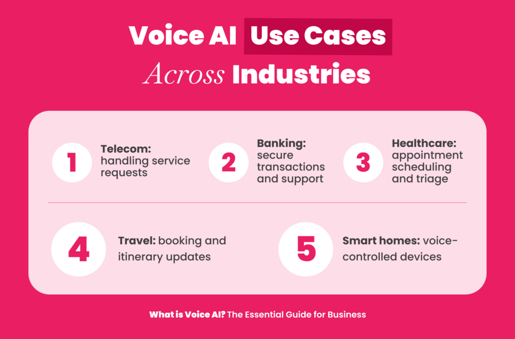 Voice AI is used in various applications, including virtual assistants, customer service systems, smart home devices, and automated voice responses. Itโ€™s employed across industries like telecom, banking, healthcare, and travel for tasks such as handling service requests, secure transactions, appointment scheduling, and booking services.